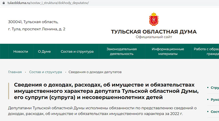 Сведения опубликованы в разделе «противодействие коррупции» на официальном сайте Тульской областной Думы. Ранее там ежегодно публиковались подробные отчеты о доходах и имуществе депутатов.