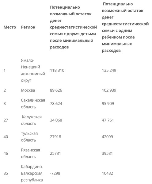 Соседняя с нами Калужская область на 27 строчке рейтинга. Там потенциально возможный остаток средств среднестатистической семьи с двумя детьми после минимальных расходов на 6 тысяч 150 рублей больше, чем у такой же семьи из нашего региона. В Рязанской области денег у среднестатистической семьи с одним ребенком денег после минимальных расходов останется меньше, чем у тульской на 2518 рублей. Рязань на 46 строчке рейтинга.