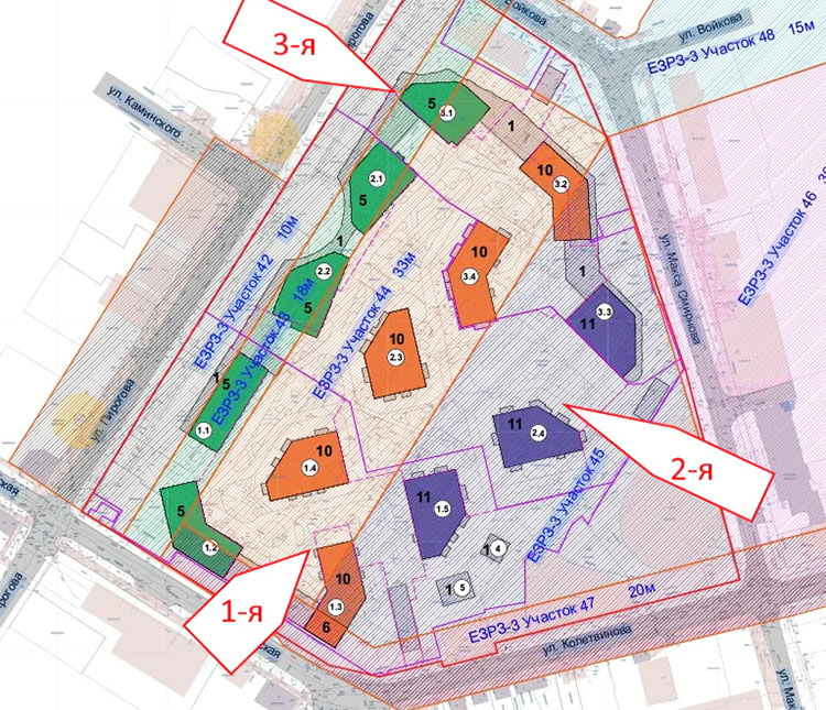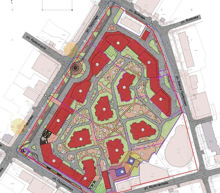 Строить жилой комплекс начнут с домов, стоящих на углу улиц Пушкинской и Пирогова, второй этап коснется домов, выходящих на улицу Пирогова, третий — домов, стоящих на углу Войкова/Макса Смирнова и Макса Смирнова/Колетвинова.