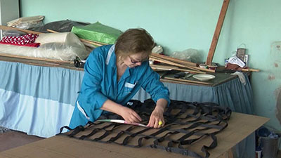 Стропную ленту нужно нарезать, опалить концы, потом разложить, переплести и сметать. Самое сложное – пошив, каждое переплетение нужно прошить по 10-20 раз. Декораторы работали вечерами и по выходным. 12 носилок театр передал в 51-й полк.