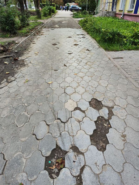 Речь идет об отрезке пути от бывшего магазина «Березка» до ул. Волнянского. Здесь на большом участке тротуара плитка отсутствует совсем, кроме того, в другом месте из-за повреждения покрытия постоянно скапливается вода.