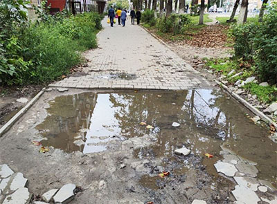 Речь идет об отрезке пути от бывшего магазина «Березка» до ул. Волнянского. Здесь на большом участке тротуара плитка отсутствует совсем, кроме того, в другом месте из-за повреждения покрытия постоянно скапливается вода.