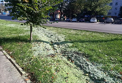 На фото видно, что участки залиты как будто кусками. Трава превратилась в болотистое образование. Как сообщил корреспондент tula.aif.ru, запах от этой консистенции исходит неприятный, явно химический, «похоже на отраву какую-то, нос щиплет».