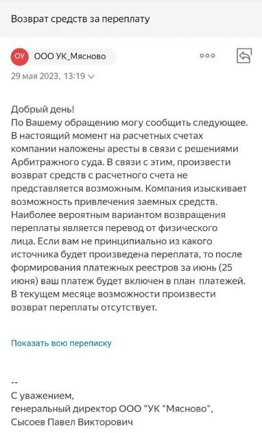 После нескольких звонков в УК 29 мая я получила ответ от Сысоева Павла Викторовича о том, что УК банкрот и деньги будут возвращаться от физического лица после 25 июня. Я подтвердила, что такой вариант меня устраивает и ждала информацию о переводе.