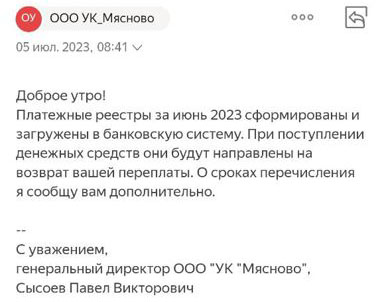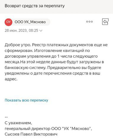 После смены УК, мной было подано заявление на возврат денежных средств (22 мая). В УК сказали, что его можно подать по электронной почте, была отправлена фотография заявления от руки с точной суммой возврата, с реквизитами и описанием всей ситуации.