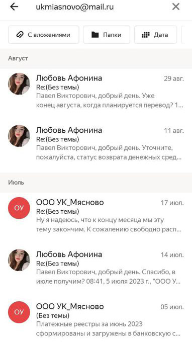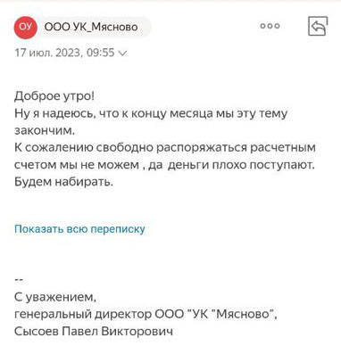 Далее я писала в УК 27 июня, 14 июля. 17 июля Павел Викторович обозначил, что платежные реестры сформированы и до конца июля вопрос будет закрыт. На мои письма от 11 августа и 29 августа ответа уже не последовало. Телефонные номера (+7 (4872) 71-66-42, +7 (4872) 71-66-62, +7 (4872) 58-32-33), ранее принадлежавшие УК, недоступны, сайт не работает.