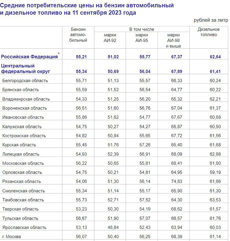Росстат опубликовал динамику цен на топливо с 5 по 11 сентября. За указанный период стоимость бензина зафиксирована в 79 субъектах РФ. Более всего он подорожал в Республике Карелия — на 3,2%, Республике Тыве и Томской области — на 3,0%.