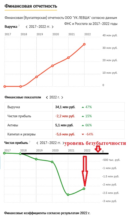 В третьих, ООО «УК «Левша» на протяжении всей своей не долгой хозяйственной деятельности была… убыточной.