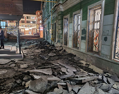 Судя по снимкам, рабочие, производившие разрытие асфальтового покрытия, могли повредить элементы фасада здания по адресу пр. Ленина 22.