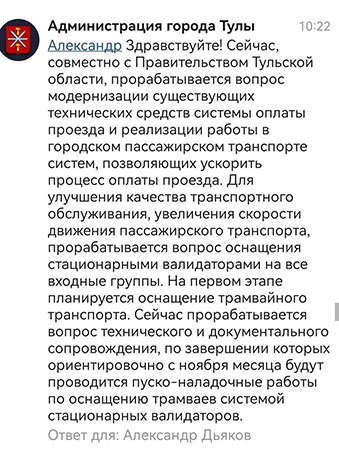 Но позвольте, качество и скорость обслуживания пассажиров повышается, когда в новенькие автобусы можно заходить через все двери и платить не водителю, отвлекая его от дороги, а в валидатор. Так сейчас работает в Львятах. Тут же купили с валидаторами, не смогли запустить, сняли, потом будут ещё деньги тратить на повторный запуск. Нет, можно было подумать, что ПО не установили или не успели настроить. Но тогда зачем снимать? А если эти валидаторы совсем не подходят к тульской системе оплаты (что сильно сомнительно), то зачем было заказывать автобусы с валидаторами.