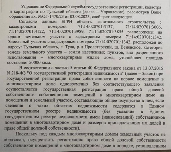 «Указанные многоквартирные дома расположены на земельном участке с кадастровым номером 71:14:020701:1342, находящемся в настоящее время в собственности муниципального образования город Тула. При этом указанный земельный участок администрацией города Тулы не формировался, право собственности муниципального образования город Тула на земельный участок зарегистрировано Управлением Росреестра по Тульской области в результате отказа от права собственности предыдущего собственника» — сообщили редакции.