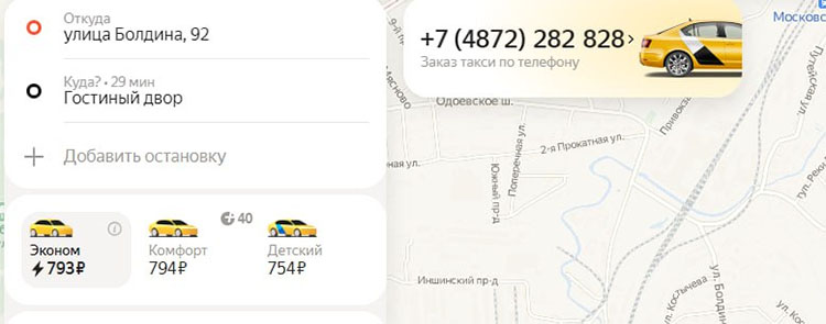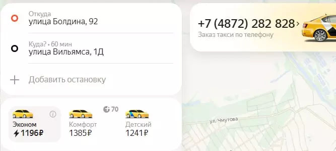 Кроме того, от улицы Болдина до Вильямса тулякам предлага[ли] уехать почти за 1 200 рублей, что сравнимо со стоимостью билета на поезд до Москвы.