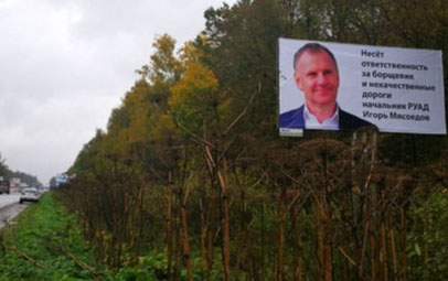 «Несет ответственность за борщевик и некачественные дороги начальник РУАД Игорь Мясоедов», — говорилось в тексте на щите.