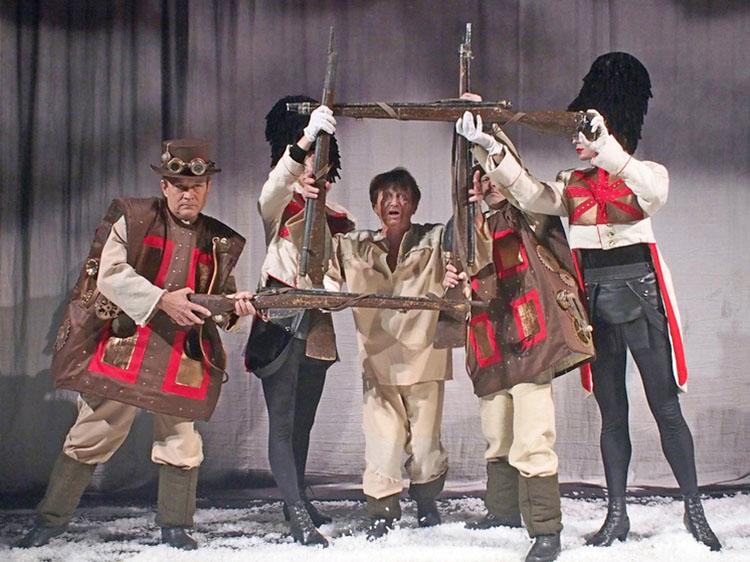 Деревянный помост, установленный под наклоном на Новой сцене Вахтанговского, собственно один и представлял собой декорацию, становясь то Европой, куда отправился русский царь Александр I в сопровождении казацкого атамана Платова, то Лондоном, где ему явили соринку в шкатулочке. «Это, – отвечают, – не соринка, а нимфозория». – «Живая она?» – «Никак нет, — отвечают , — не живая, а из чистой из аглицкой стали в изображении блохи нами выкована, и в середине в ней завод и пружина. Извольте ключиком повернуть: она сейчас и начнет дансе танцевать». Актриса, исполнявшая роль блохи, била чечетку, к ней весело присоединились другие. Потом Англию на помосте сменяли покои русского императора Николая I, под ним же Левша со товарищами колдовали над аглицким изобретением, а ближе к финалу его раскачивало бушующее море, которым в Петербург возвращался Левша.