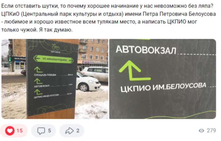 Тулякам, конечно, понятно, что речь о Центральном парке культуры и отдыха им. Петра Петровича Белоусова, но досадная ошибка не может не расстраивать.