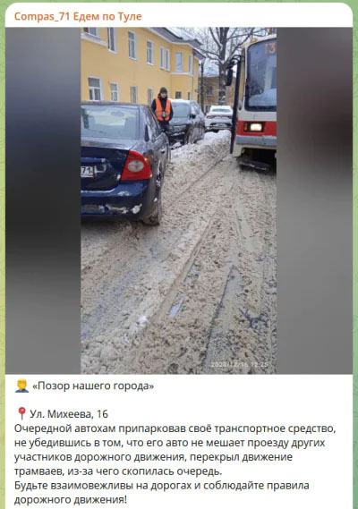 Специально для автохамов подведомственный городской администрации Telegram-канал «Compas_71 Едем по Туле» создал рубрику «Позор нашего города». Здесь ежедневно появляются фотографии тех, кто оставляет свои машины прямо на трамвайных путях или рядом с ними, парализуя работу общественного транспорта. Такой вот метод общественного порицания.