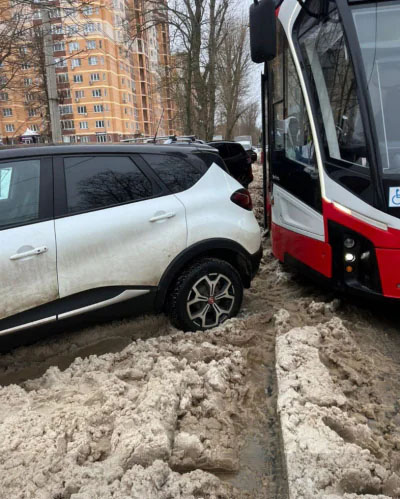 «Улица Коминтерна, д. 23. Очередной автохам, припарковав свое транспортное средство, не убедившись в том, что его авто не мешает проезду других участников дорожного движения, перекрыл движение трамваев, из-за чего скопилась очередь».