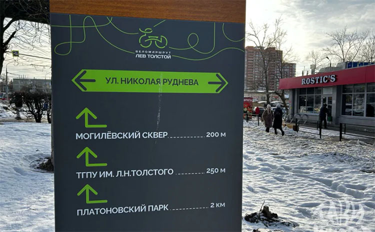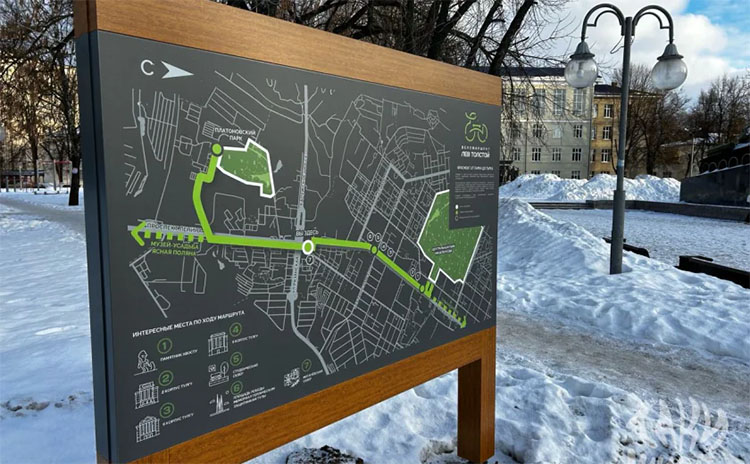 Также на проспекте Ленина появились указатели для веломаршрута «Лев Толстой». Они выполнены в той же стилистике.