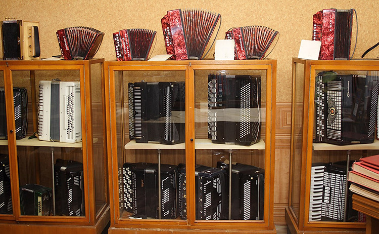 На шкафу стоят однотембровые гармони для детского инструментального ансамбля. Каждая гармонь настроена на свою тональность и играет свою, специально написанную партию.