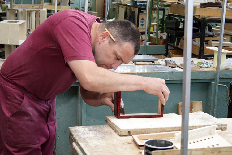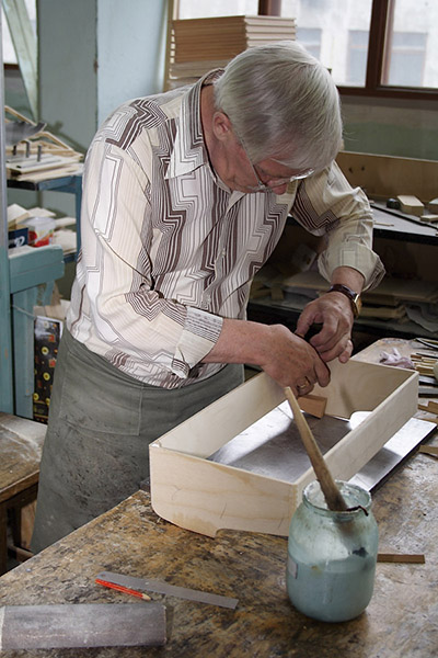 Потом мы посетили высококлассного мастера, который занимается изготовлением корпусов к дорогим концертным баянам. Здесь уже применяется буковая доска и красное дерево.