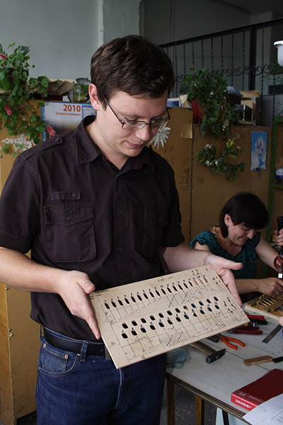 Мастер язычковых инструментов ловкими движениями и при помощи ножных мехов проверяет звучание планки на компьютере (в деке встроен микрофон) и в случае его не соответствия подтачивает язычок до нужной тональности.