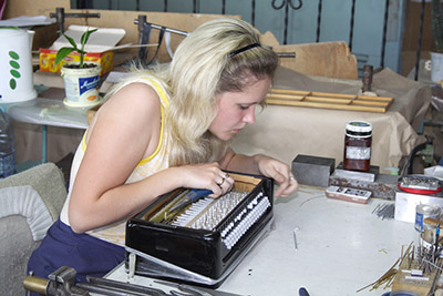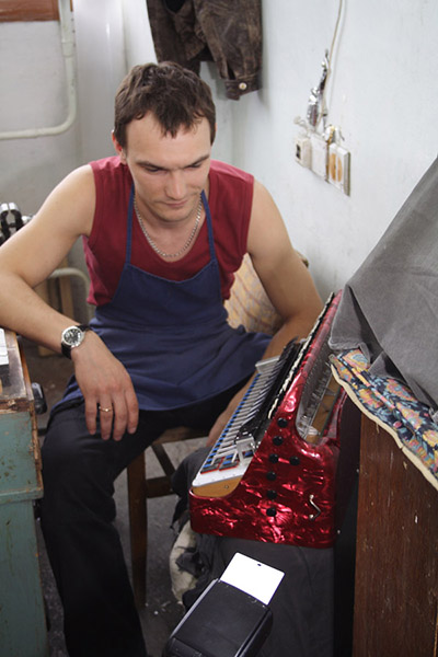 Мастер доводит до ума аккордеон с гнутой декой.