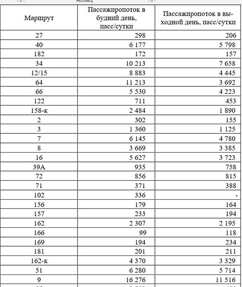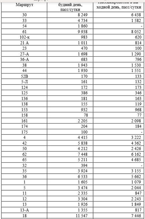 Шишкин также обратил внимание на таблицу, из которой можно сделать вывод, что 25 автобусов большого и среднего класса на самом загруженном городском маршруте автобуса (18-й маршрут) перевезли пассажиров в 1,5 раза меньше, чем 30 маршруток малого класса 9-го маршрута.