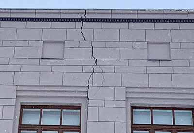 Вероятно, трещины в здании возникли из-за строительства фондохранилища, которое вплотную прилегает к зданию музея. Насколько они опасны для здания, оценить сложно.