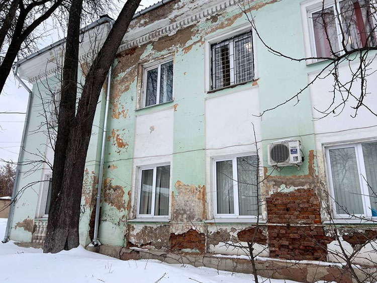 Стены снаружи покрыты большими трещинами. Штукатурка хоть и на месте в большей степени, но местами она отсутствует достаточно крупными кусками. И так со всех сторон фасада.