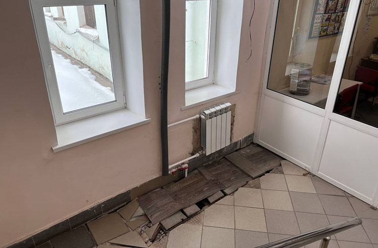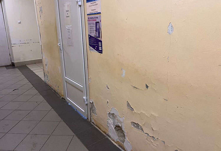 Внутри ситуация не лучше. Обшарпанные стены, местами проваливается пол. Плесень. Удивительно, что при такой отделке тепло здание еще сохраняет, если верить словам пациентов. Но внешний вид не единственная проблема.