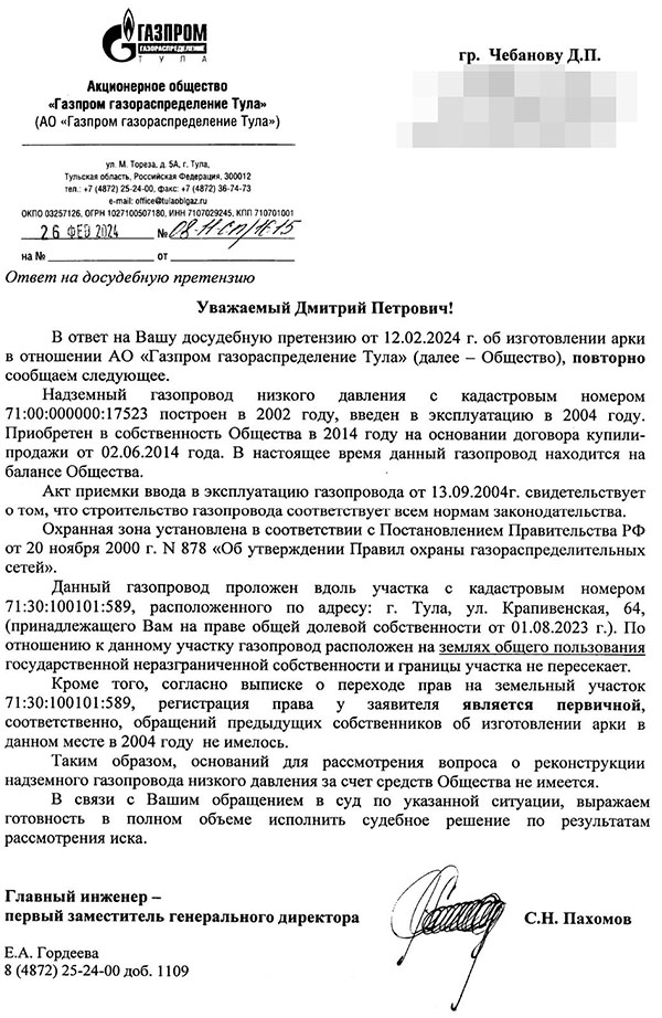 — Арки нет, никакая строительная техника заехать на участок не сможет, — говорит Дмитрий. — И как можно там что-то построить — неизвестно. Газопровод находится на балансе «Газпром газораспределение Тула», туда я и обратился с просьбой сделать въездную арку высотой 3,5 м. Без нее я не смогу полноценно пользоваться участком.