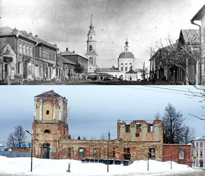 Та самая церковь в самом центре Одоева в XIX веке и сегодня. / Игорь Черняк