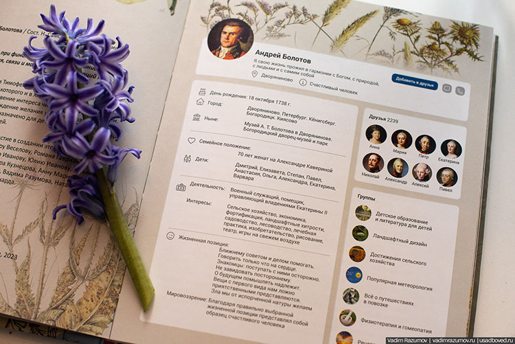 В прошлом году ко мне обратилась команда тульского издательства «Свамия», решившая создать научно-популярную книгу об Андрее Тимофеевиче Болотове. И каково же было мое удивление, когда я узнал, что концепция книги выстроена вокруг научно-популярного стиля, а одна из первых страниц издания оформлена в виде…импровизированной страницы Болотова в социальной сети. Болтов-блогер раскрывает современному читателю о собственных жизненных принципах, секретах душевной гармонии и долголетия, любимых проектах и местах.