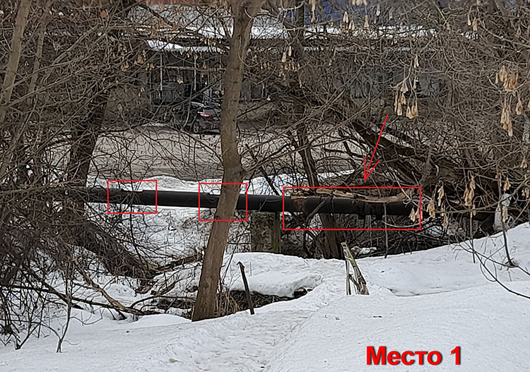 Обозначено на карте как № 1, (Находится в районе дома № 197А по ул. Демонстрации) тут стальная труба на бетонных опорах пересекает ручей Серебровку (который впадает в Воронку). В трубе прорезаны три окна, последнее, ближе к берегу заглушено хомутами, но как видно содержимое они не держат. Фото обозначены, как место №1, сделаны со стороны Татарки и родничка. Здесь утечка сравнительно маленькая.