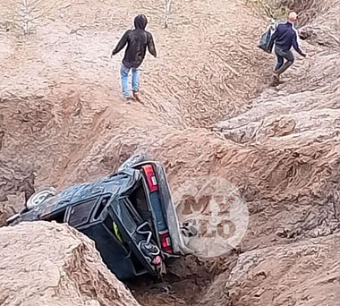 Инцидент произошел [в субботу] днем: в Кондуках с вершины одной из горы слетел автомобиль. Он приземлился на бок, застряв в расщелине.