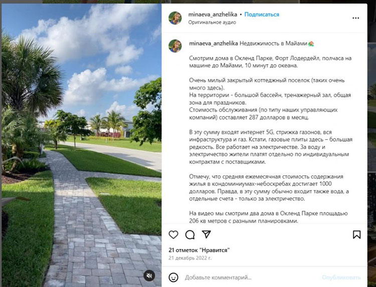 Сам же бывший издатель «МК в Туле», экс-владелец сети автомоек города Олег Минаев и его супруга, бывший редактор «МК в Туле» Анжелика Минаева вот уже полтора года живут во Флориде (США), в городке Бока Ратон. Это популярный курорт восточного побережья Флориды. Судя по блогу Анжелики Минаевой, которая ведет его в социальной сети Instagram* жизнь у супружеской четы складывается, в общем-то, неплохо. Семья живет в частном доме (собственном или арендуемом), их дети ходят в школу в том же городке Бока Ратон. Правда, чем конкретно заняты Олег Минаев и Анжелика Минаева в США, где работают и на что вообще живут – понять решительно невозможно. Зато из многочисленных постов в Instagram* можно понять, что у Анжелики Минаевой много свободного времени. Его она посвящает отдыху и развлечениям, комментированию политических событий в России, отпусканию колкостей в адрес бывших соотечественников и коллег, оставшихся в Туле. Тем не менее совсем зря свое время Анжелика не теряет, завязывает всевозможные полезные знакомства среди местного политистеблишмента.