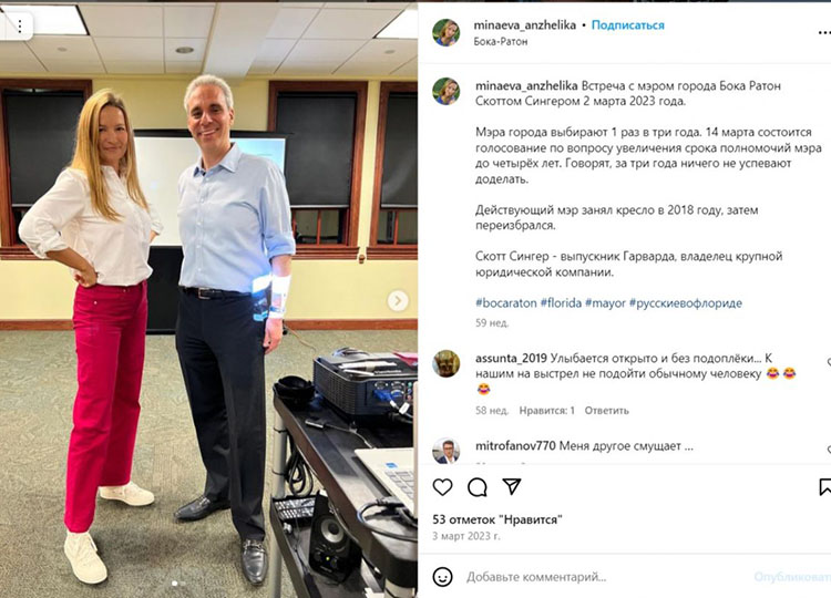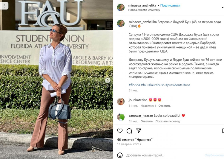Судя по ее постам, она встречалась с мэром городка Бока Ратон Скоттом Сингером, а также навещала не абы кого, а саму Лауру Буш, 48-ую первую леди США, супругу 43-ого президента США Джорджа Буша (был президентом в 2001-2009 гг.). Встреча состоялась во Флоридском Атлантическом Университете. Несмотря на то что Лауре Буш и Джорджу Бушу по 76 лет, они продолжают вести активный образ жизни, участвуют в политической и общественной жизни Америки. И эта встреча Анжелики Минаевой особенно интересна, так как «просто так», встретиться с семьей пусть и бывшего президента США, нельзя. Семьи пусть и бывших, но президентов США, принадлежат к высшему политическому истеблишменту Америки, это особый и замкнутый мир с постоянной охраной и досугом, который как правило, не скрашивают незнакомые «третьи лица». Попасть в такой круг общения обычному смертному, да еще эмигранту из России ох как не просто, такое право нужно заслужить.