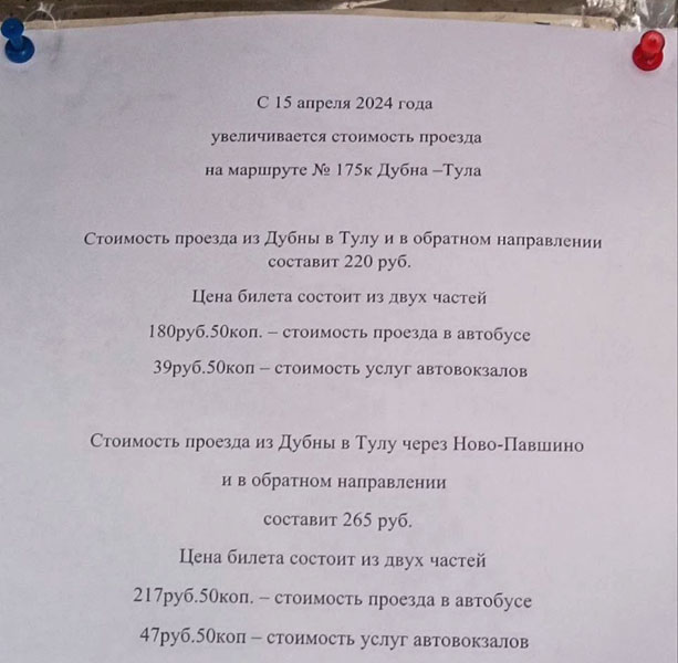 В редакцию Myslo обратился туляк Дмитрий О. Он сообщил, что с 15 апреля ООО «Алексинское ПАТП» повысило стоимость проезда по коммерческим маршрутам «Тула-Дубна» и «Дубна-Тула». К 180,5 рублям оплаты за проезд, добавились ещё 39,5 — за «пользование автовокзалами». А до апреля стоимость проезда составляла и вовсе 160 рублей.