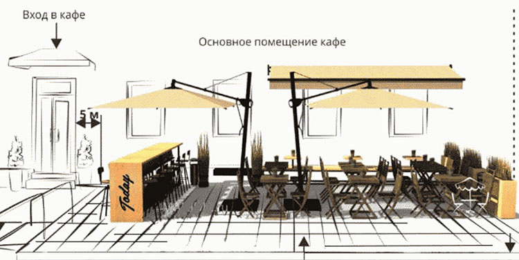 Веранды летних кафе в Туле должны быть выполнены в едином архитектурно-художественном стиле с учетом внешнего вида фасадов зданий, где они находятся. Зонтики не должны быть выше первого этажа, а их расцветка может быть бежевой, бордовой, серой или зеленой.