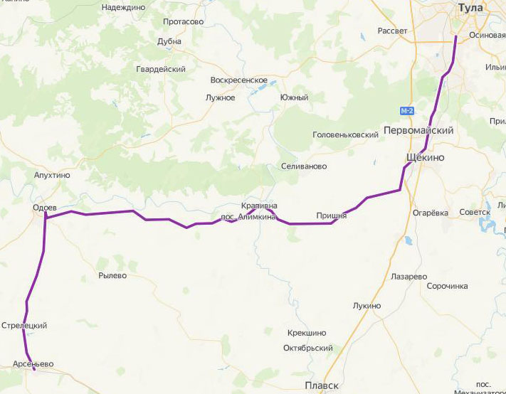 Расстояние от Тулы до Арсеньево — 103 км. Время в пути — 1 ч 20 мин.