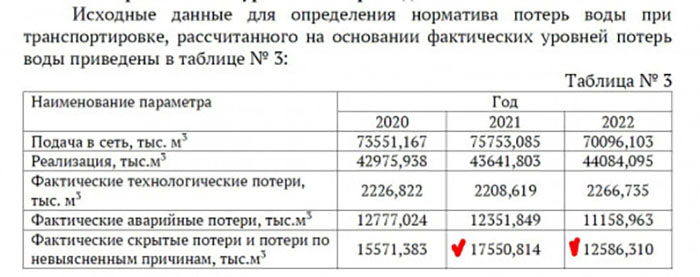 P.S. Ниже скрин таблицы, которой Тулагорводоканал обосновывает потери. Посмотрите колебания: в 22 году «скрытых потерь» на 5 млн кубов стало меньше… Внезапно…