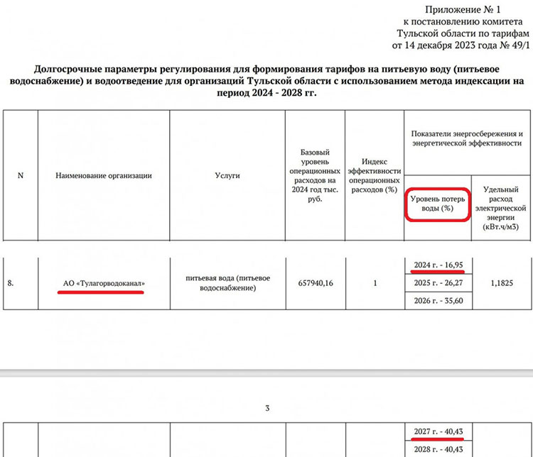 Наверняка внимание граждан, решивших ознакомиться с указанным выше постановлением, привлекут данные по уровню потерь питьевой воды, которые установлены комитетом по тарифам для водоснабжающих организаций. Вот что можно увидеть по АО «Тулагорводоканал»: