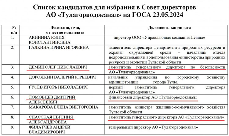 Конечно, нельзя не обратить внимание и на фамилии заместителей руководителя монополиста, их обладатели ранее занимали высокие посты в правоохранительных органах и областном правительстве (список кандидатов для избрания в Совет директоров — только как источник информации о должностях):
