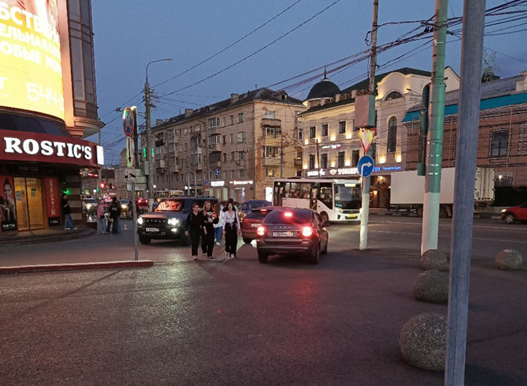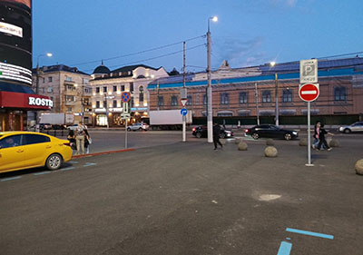 Вдоль Гостинки один из самых насыщенных пешеходами тротуар в Туле. Въезд с Советской сделали под углом , видимо чтобы авто могло на большей скорости залетать на парковку. Выезд на Советскую запретили знаком, но не все на него смотрят. Как результат получили конфликтную точку межу пешеходами и автомобистами на ровном месте.