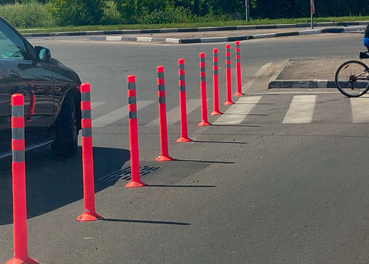 Оранжевыми столбиками перегородили пешеходный переход. Всё это ради того, чтобы разделить потоки авто при выезде на Рязанку: правый ряд направо, левый ряд налево. Причем мы то привыкли, что столбики разделяют движение в противоположных направлениях, а тут между рядами одного направления поставили.