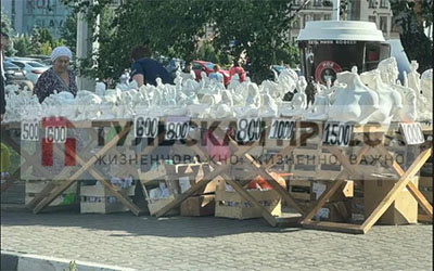 В воскресенье, 7 июля, в центре Тулы — прямо напротив кремля — вырос неизвестный развал. На пешеходном переходе через Менделеевскую улицу — от музея самоваров к зданию регионального правительства — развернули активную торговлю гипсовыми скульптурами. Выставленные сомнительные произведения искусства были на хлипких столах, ценники к ним были написаны от руки на картоне.