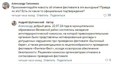 Myslo сообщил об отмене Фэнтези Феста в Золотом городе. Это подтвердили в администрации муниципального образования (условия проведения не согласовали с организаторами). [Вчера] Андрей Шубчинский — глава администрации МО Венёвский район — лично продублировал эту информацию у себя на странице: