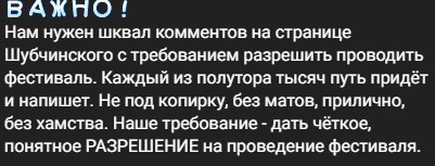— Каждый из полутора тысяч пусть придёт и напишет коммент на странице Шубчинского. Наше требование — дать чёткое, понятное разрешение на проведение фестиваля.