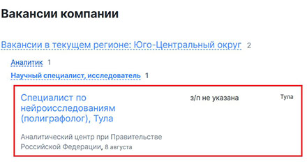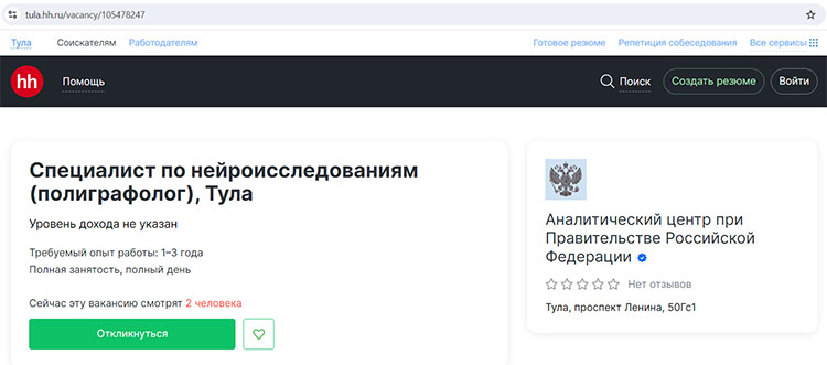Аналитический центр при Правительстве Российской Федерации ищет в оружейной столице специалиста по нейроисследованиям (полиграфолога).