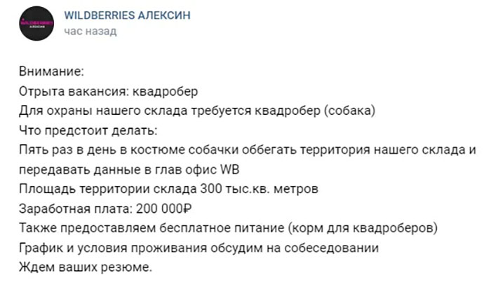 В объявлении говорится о поиске квадробера. Человек в костюме собаки должен пять раз в день обегать территорию клада, а это 400 тыс. кв. м, а затем сообщать данные в главный офис маркетплейса.